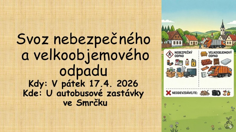 17. 04. 2026 v 16:00 hodin za autobosovou zastávkou ve Smrčku.